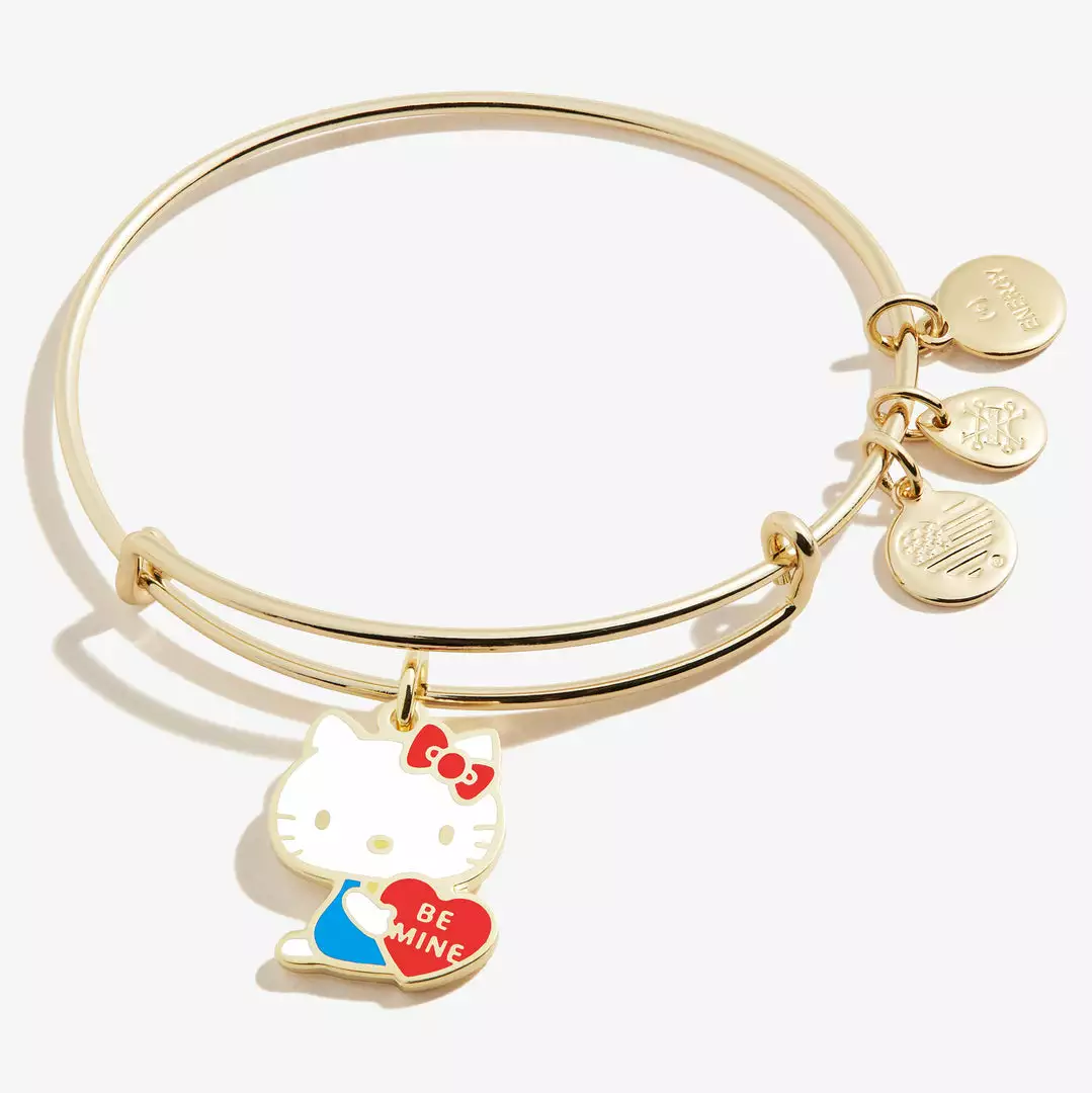 This expandable wire bangle is oh so cute and charming! It features Hello Kitty holding a red heart with a message that says “Be Mine,” along with a few other gold coin charms.
