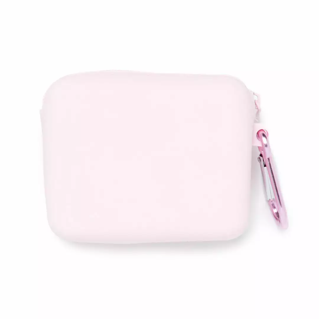 Keep your loose bills, earphones, and more in this handy silicone pouch. It features a die-cut My Melody applique at the front with a heart-shaped carabiner for easy carrying.