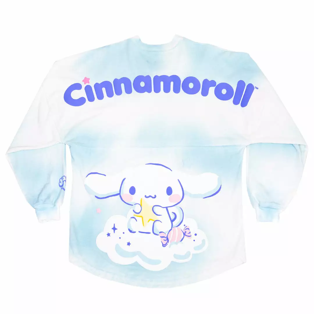 This Cinnamoroll JapanLA Spirit Jersey features a light blue and white cloud tie dye unisex Spirit Jersey top with puff printing of Cinnamoroll on the front. On the upper back, Cinnamoroll’s name is printed in periwinkle super puff! The lower back has a large graphic of Cinnamoroll sitting of a fluffy cloud holding a star. The JapanLA Logo is printed on the left sleeve.