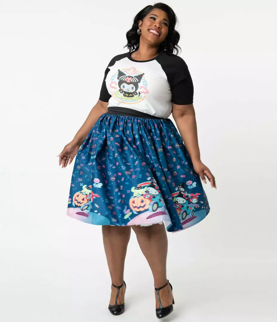 Be like Kuromi and spread havoc wherever you go in this swing skirt from Unique Vintage with Hello Kitty. Designed in a smooth woven blend, this knee-length skirt features Hello Kitty and her friends going on a spooky Halloween joyride! It also has a banded high waist, gathered A-line silhouette, and hidden side pockets to keep all your treats within reach.