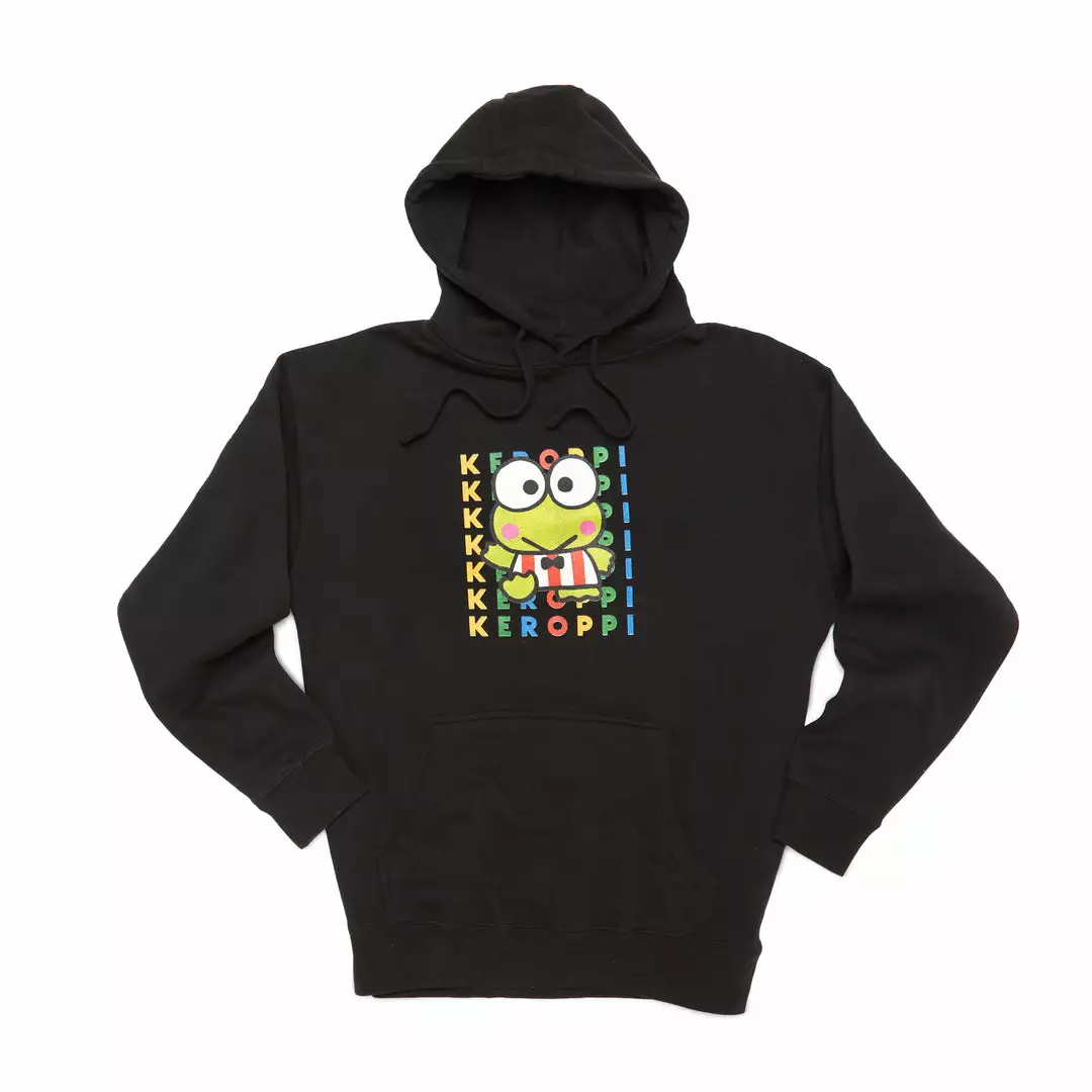 Kerokerokeroppi! Did you know that “kero” is the sound for a frog in Japanese? This black hoodie has a playful palette of primary colors with Keroppi front and center!