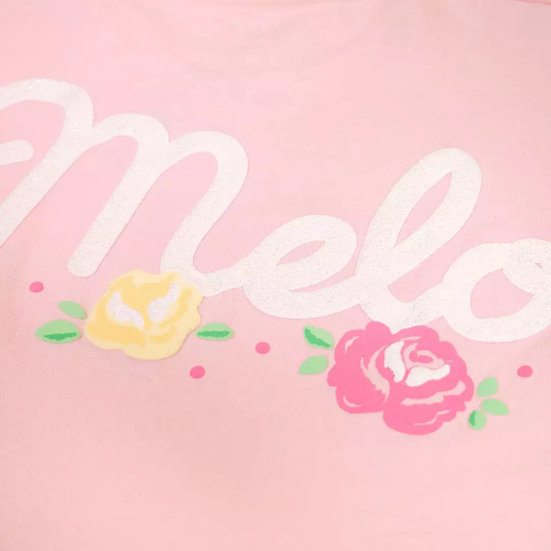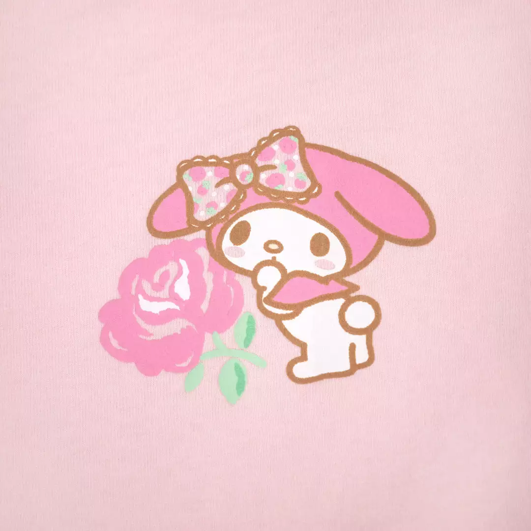 This My Melody JapanLA Spirit Jersey features a light pink unisex Spirit Jersey top with puff printing of My Melody and a pink rose on the front. On the upper back, My Melody’s name is printed using white super puff and glitter. On the lower back is a large graphic of My Melody surrounded by pink and yellow glitter roses! The JapanLA Logo is printed on the left sleeve.